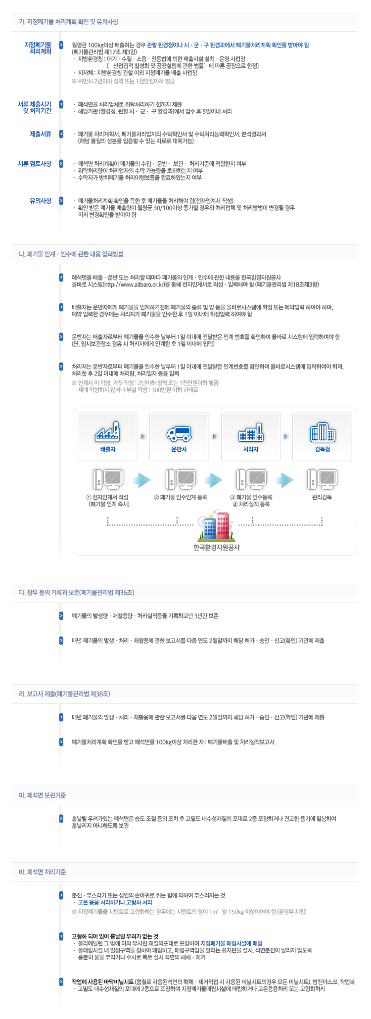 즉 환경 부령이 정하는 양 이상의 지정 폐기물을 배출하는자는 관련서류를 환경관리청장 또는 시장·군수·구청장에게 제출하여 확인을 받아야 하며, 변동이 있을 때에는 변경 확인을 받아야 한다.