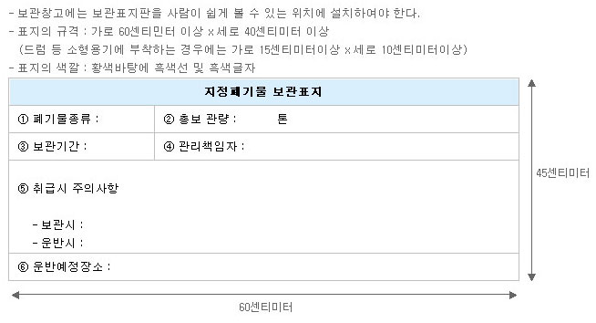 지정폐기물의 보관창고에는 보관중인 지정폐기물로 양 및 보관기 관 등을 기재한 다음의 표지판을 설치하여야 한다. 다만, 드럼 등 보관용기를 사용하여 보관하는 경우에는 용기별로 폐기물의 종류·양 및 배출업소 등을 알 수 있는 표시를 하여야 하고, 지정폐기물의 종류가 같은 용기가 여러개있는 경우에는 폐기물의 종류별로 폐기물의 종류·양 및 배출업소 등을 알 수 있는 표시를 하여야 한다.